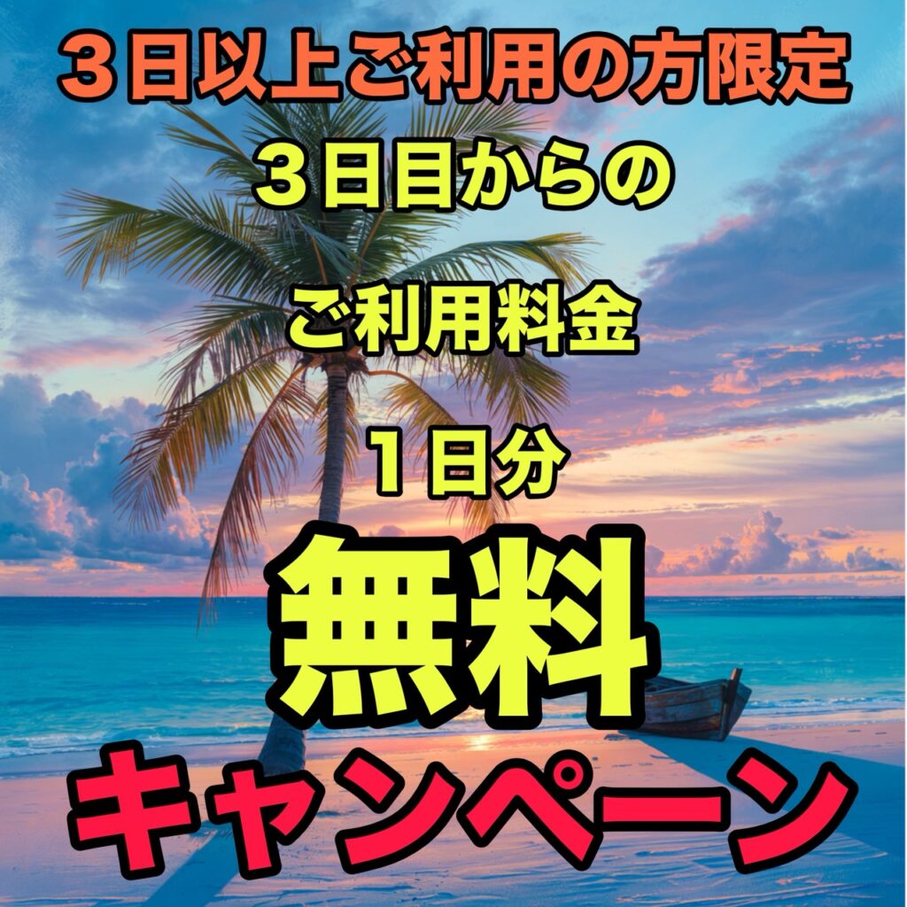 【3日以上ご予約の方限定!3日目からの1日分無料キャンペーン!】を選択してご予約下さい。